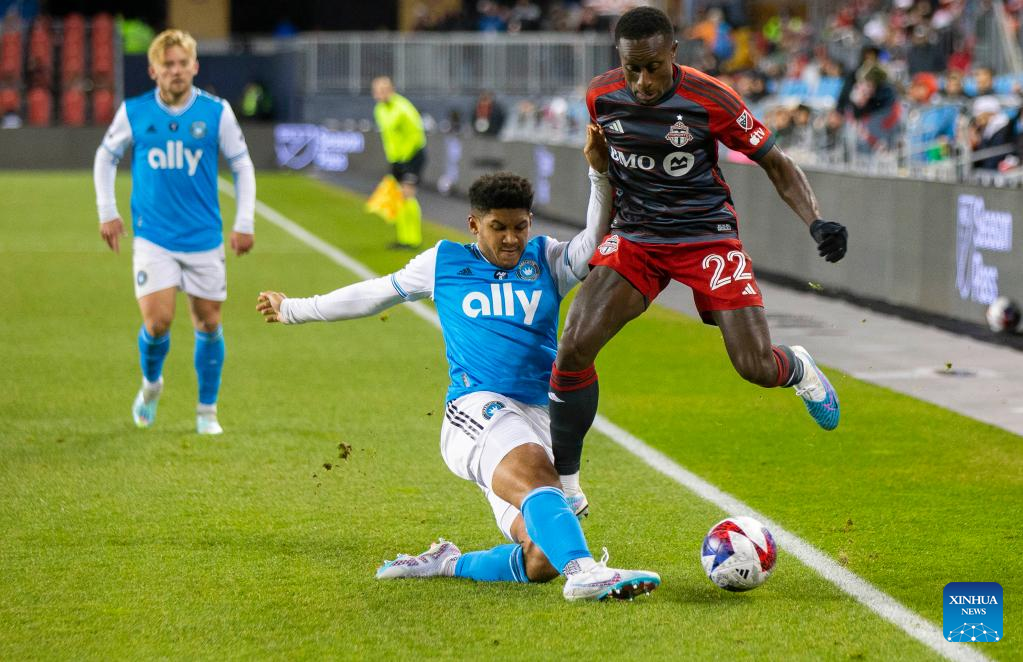 Richie Laryea (R) of Toronto FC vies with Jaylin Lindsey of Charlotte FC during their 2023 Major League Soccer (MLS) match at BMO Field in Toronto, Canada, on April 1, 2023. (Photo by Zou Zheng/Xinhua)
