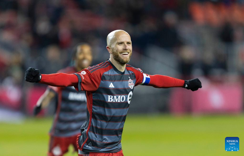 Michael Bradley of Toronto FC celebrates scoring during the 2023 Major League Soccer (MLS) match between Toronto FC and Charlotte FC at BMO Field in Toronto, Canada, on April 1, 2023. (Photo by Zou Zheng/Xinhua)