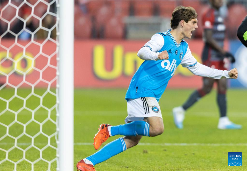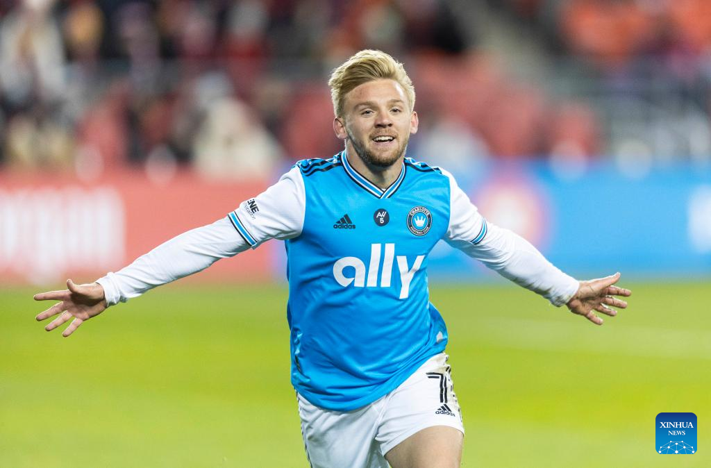 Ben Bender of Charlotte FC celebrates scoring during the 2023 Major League Soccer (MLS) match between Toronto FC and Charlotte FC at BMO Field in Toronto, Canada, on April 1, 2023. (Photo by Zou Zheng/Xinhua)