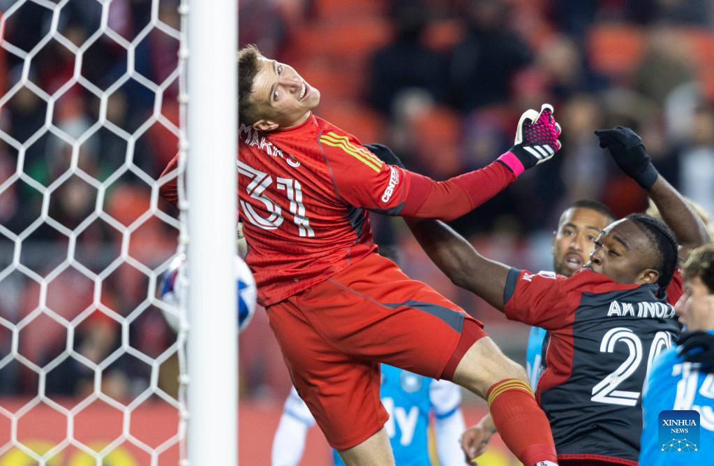 Goalkeeper George Marks (L) of Charlotte FC watches the ball flying into the goal during the 2023 Major League Soccer (MLS) match between Toronto FC and Charlotte FC at BMO Field in Toronto, Canada, on April 1, 2023. (Photo by Zou Zheng/Xinhua)