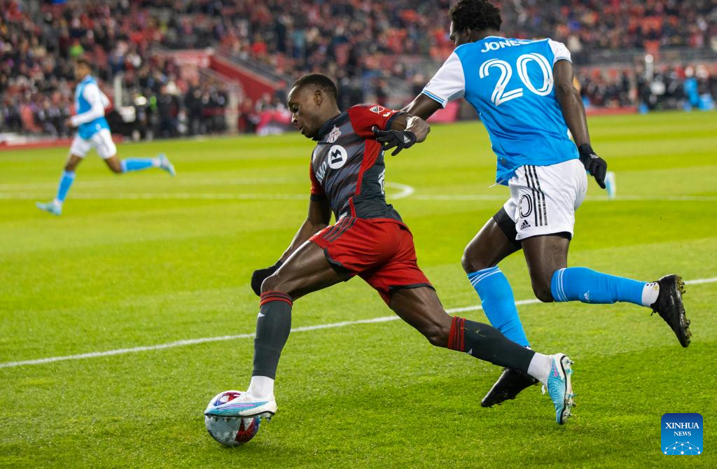 Richie Laryea (L) of Toronto FC breaks through during the 2023 Major League Soccer (MLS) match between Toronto FC and Charlotte FC at BMO Field in Toronto, Canada, on April 1, 2023. (Photo by Zou Zheng/Xinhua)