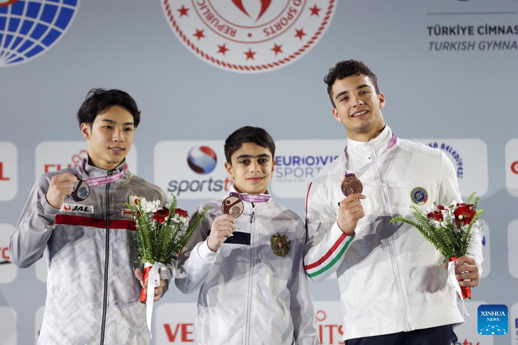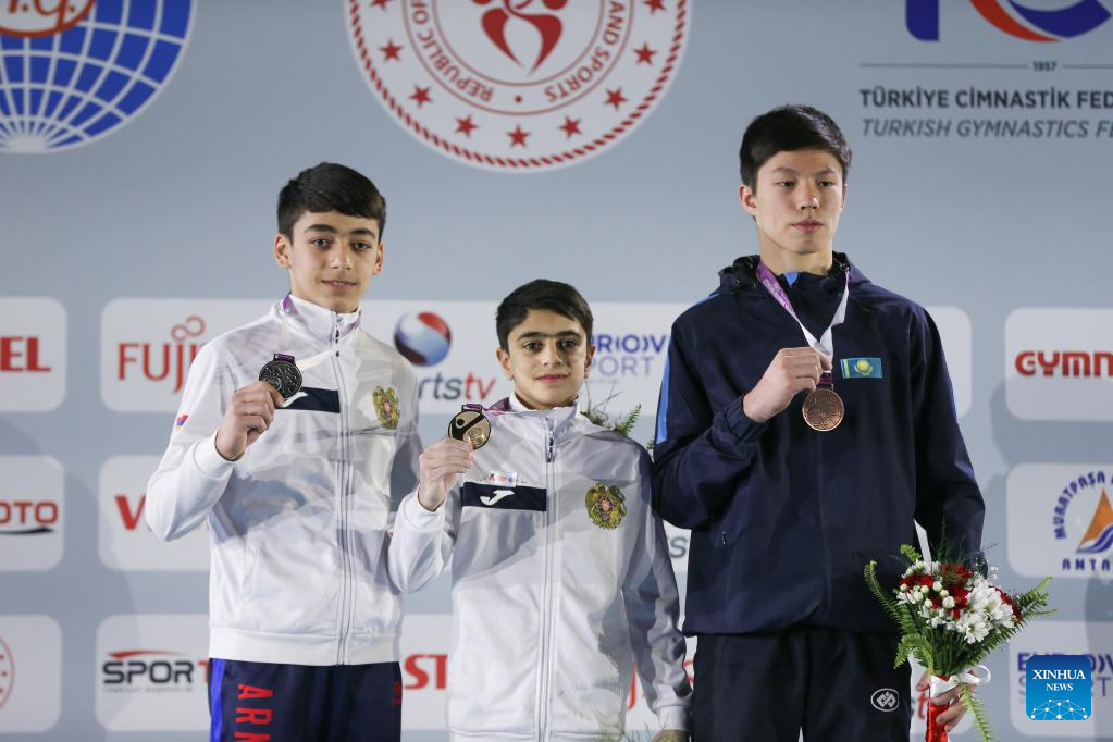 Gold medalist Hamlet Manukyan (C) of Armenia, silver medalist Mamikon Khachatryan (L) of Armenia and bronze medalist Zeinolla Idrissov of Kazakhstan attend the awarding ceremony for the men's pommel horse final at the 2nd Artistic Gymnastics Junior World Championships in Antalya, Türkiye, April 1, 2023. (Photo by Mustafa Kaya/Xinhua)
