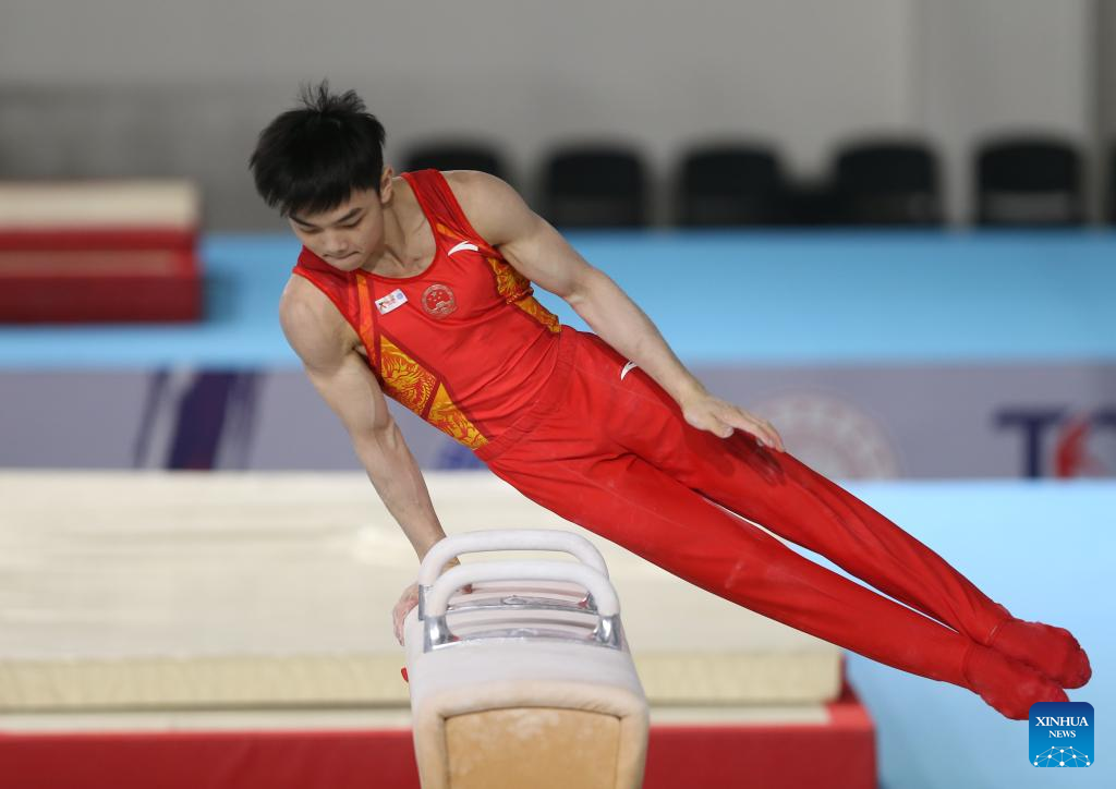 He Xiang of China competes during the men's pommel horse final at the 2nd Artistic Gymnastics Junior World Championships in Antalya, Türkiye, April 1, 2023. (Photo by Mustafa Kaya/Xinhua)