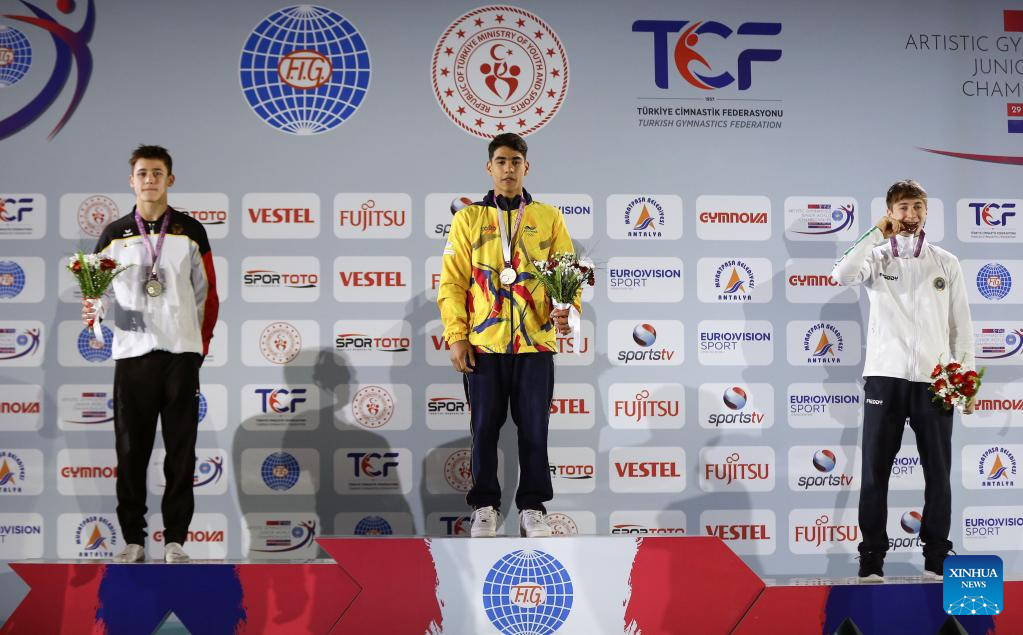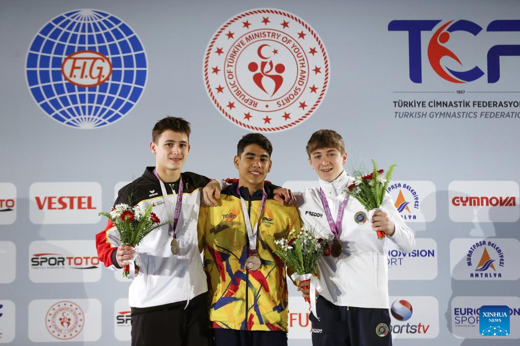 Gold medalist Angel Barajas (C) of Colombia, silver medalist Timo Eder (L) of Germany and bronze medalist Tommaso Brugnami of Italy attend the awarding ceremony for the men's floor exercise final at the 2nd Artistic Gymnastics Junior World Championships in Antalya, Türkiye, April 1, 2023. (Photo by Mustafa Kaya/Xinhua)