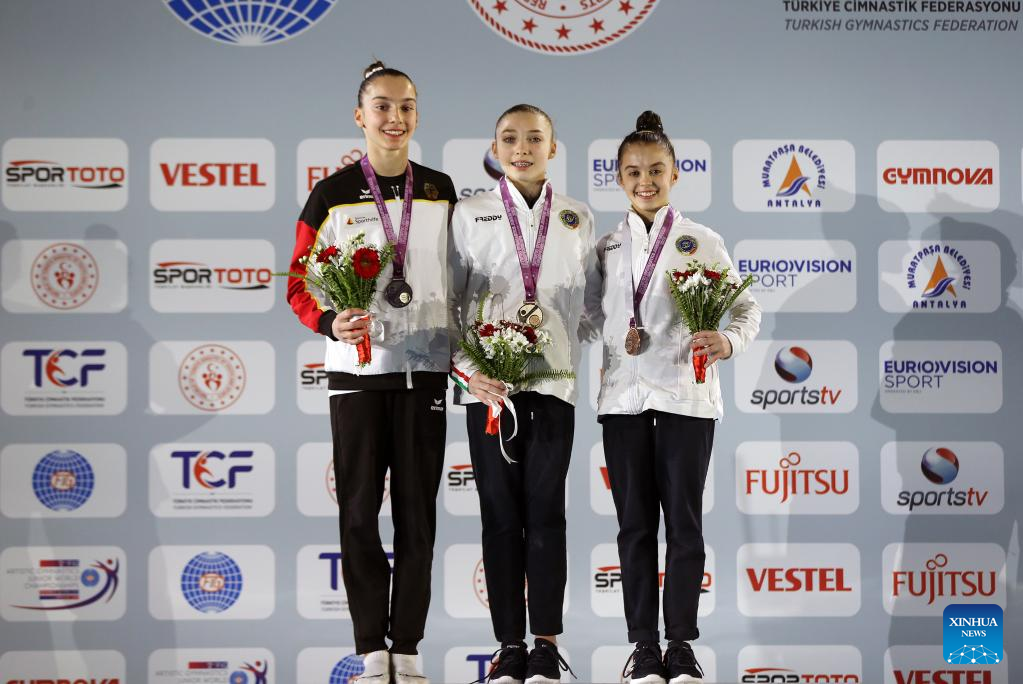 Gold medalist Caterina Gaddi (C) of Italy, silver medalist Helen Kevric (L) of Germany and bronze medalist Giulia Perotti of Italy attend the awarding ceremony for the women's uneven bars final at the 2nd Artistic Gymnastics Junior World Championships in Antalya, Türkiye, April 1, 2023. (Photo by Mustafa Kaya/Xinhua)