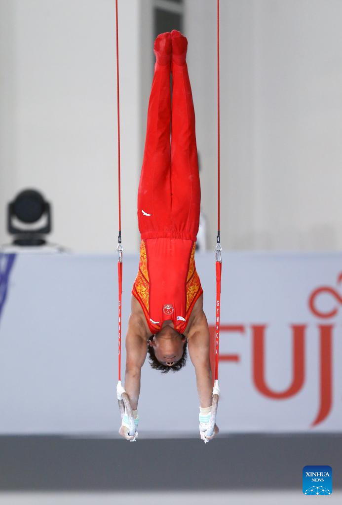 Yang Chunjie of China competes during the men's rings final at the 2nd Artistic Gymnastics Junior World Championships in Antalya, Türkiye, April 1, 2023. (Photo by Mustafa Kaya/Xinhua)