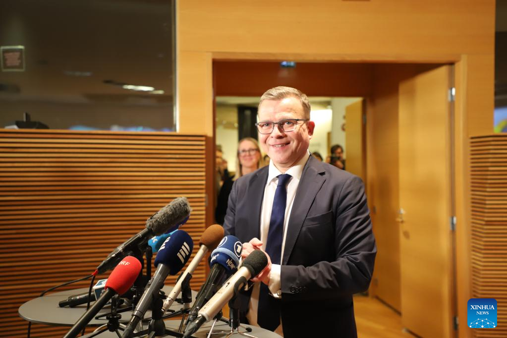 Finland's National Coalition Party leader Petteri Orpo attends a press conference in Helsinki, Finland, April 2, 2023. Finland's opposition National Coalition Party emerged as the largest party in the parliamentary election held on Sunday, according to the preliminary result reported by Finnish national broadcaster Yle. (Xinhua/Chen Jing)