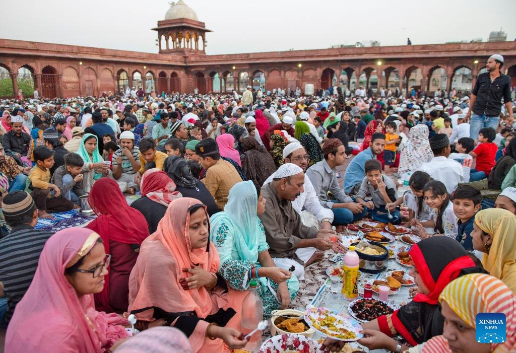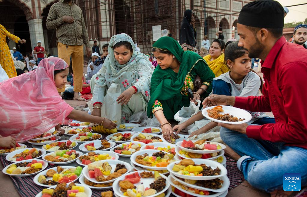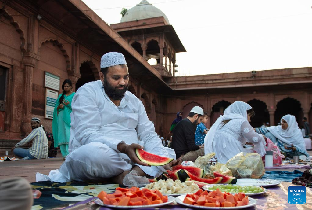 People wait to break fast during the holy month of Ramadan at historic Jama Masjid (grand mosque) in New Delhi, India, April 3, 2023. (Xinhua/Javed Dar)