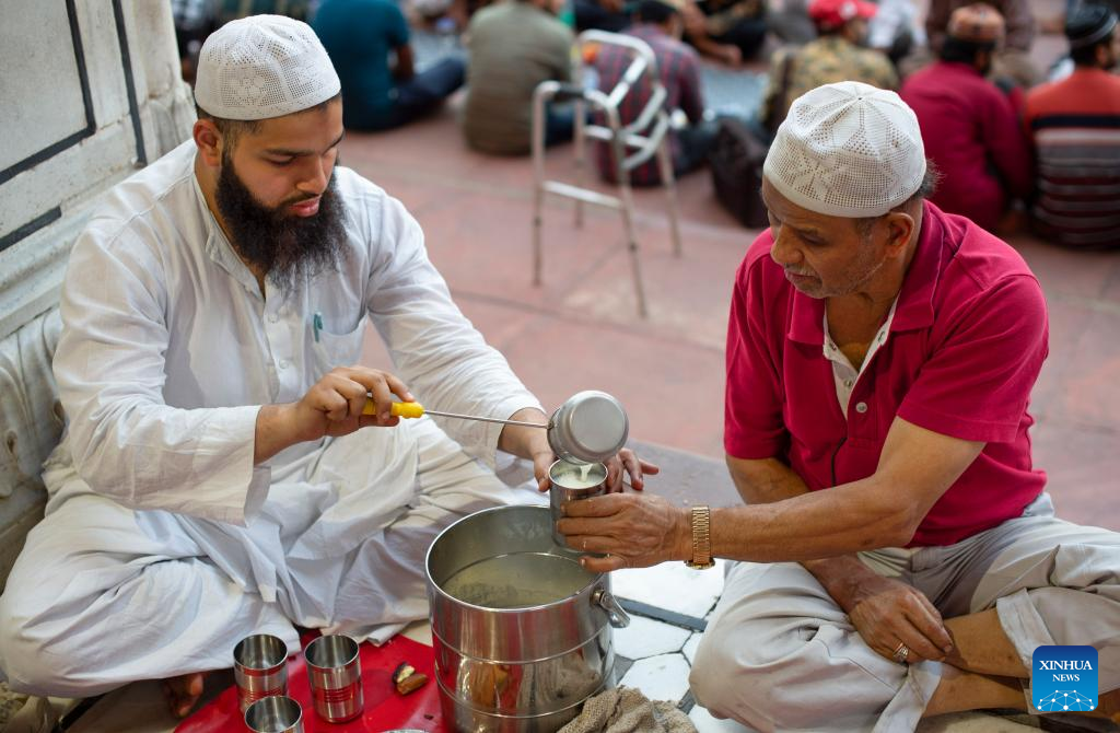 People prepare milk drinks to break fast during the holy month of Ramadan at historic Jama Masjid (grand mosque) in New Delhi, India, April 3, 2023. (Xinhua/Javed Dar)