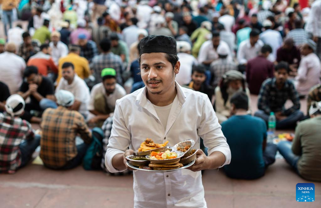 A man carries snacks for people to break fast during the holy month of Ramadan at historic Jama Masjid (grand mosque) in New Delhi, India, April 3, 2023. (Xinhua/Javed Dar)