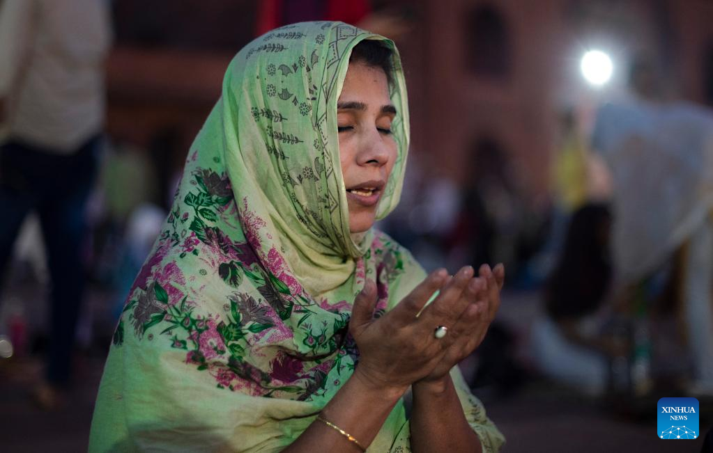 A woman prays after breaking fast during the holy month of Ramadan at historic Jama Masjid (grand mosque) in New Delhi, India, April 3, 2023. (Xinhua/Javed Dar)
