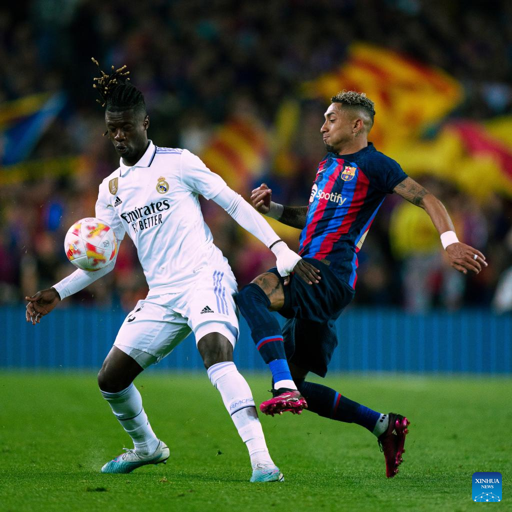 Raphinha (R) of Barcelona vies with Eduardo Camavinga of Real Madrid during the King's Cup semifinal second leg match between FC Barcelona and Real Madrid in Barcelona, Spain, April 5, 2023. (Photo by Joan Gosa/Xinhua)