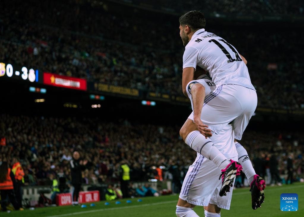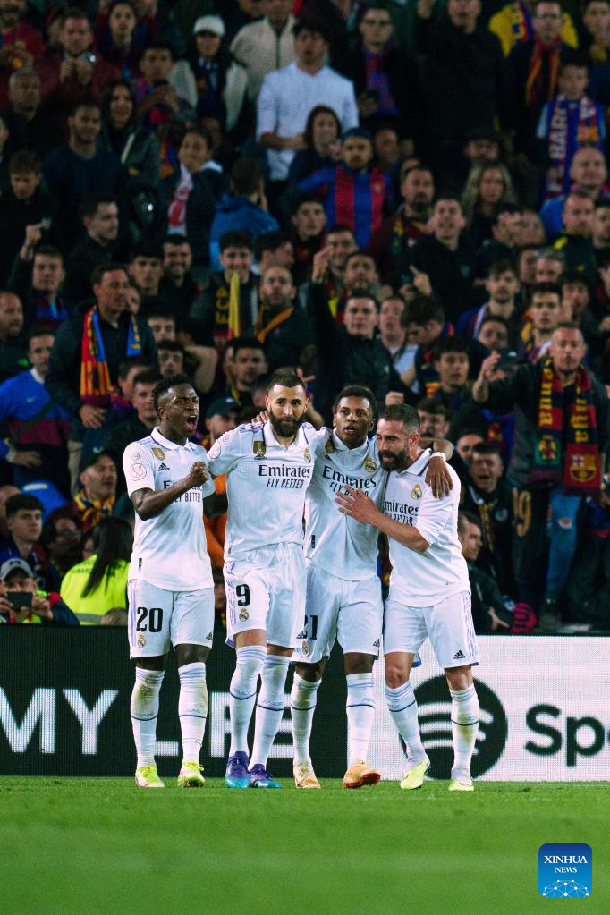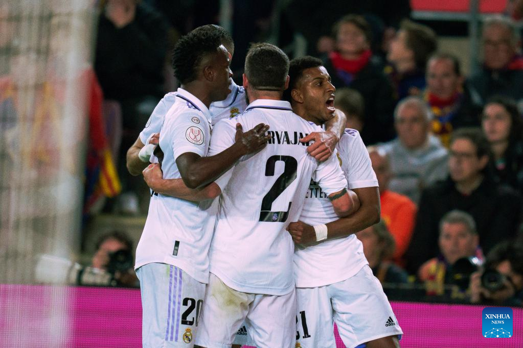 Players of Real Madrid celebrate a goal during the King's Cup semifinal second leg match between FC Barcelona and Real Madrid in Barcelona, Spain, April 5, 2023. (Photo by Joan Gosa/Xinhua)