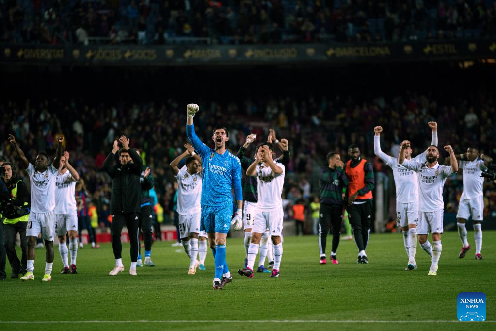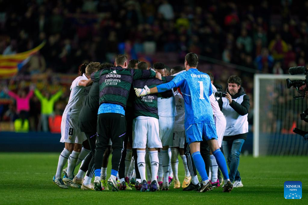 Players of Real Madrid celebrate victory after the King's Cup semifinal second leg match between FC Barcelona and Real Madrid in Barcelona, Spain, April 5, 2023. (Photo by Joan Gosa/Xinhua)