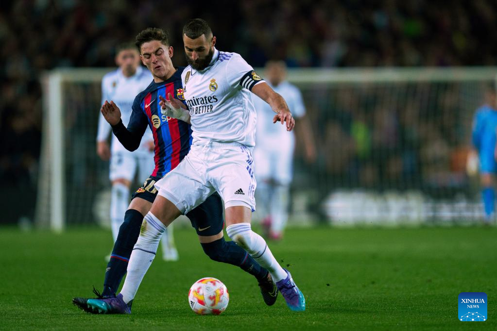 Gavi (L) of Barcelona vies with Karim Benzema of Real Madrid during the King's Cup semifinal second leg match between FC Barcelona and Real Madrid in Barcelona, Spain, April 5, 2023. (Photo by Joan Gosa/Xinhua)