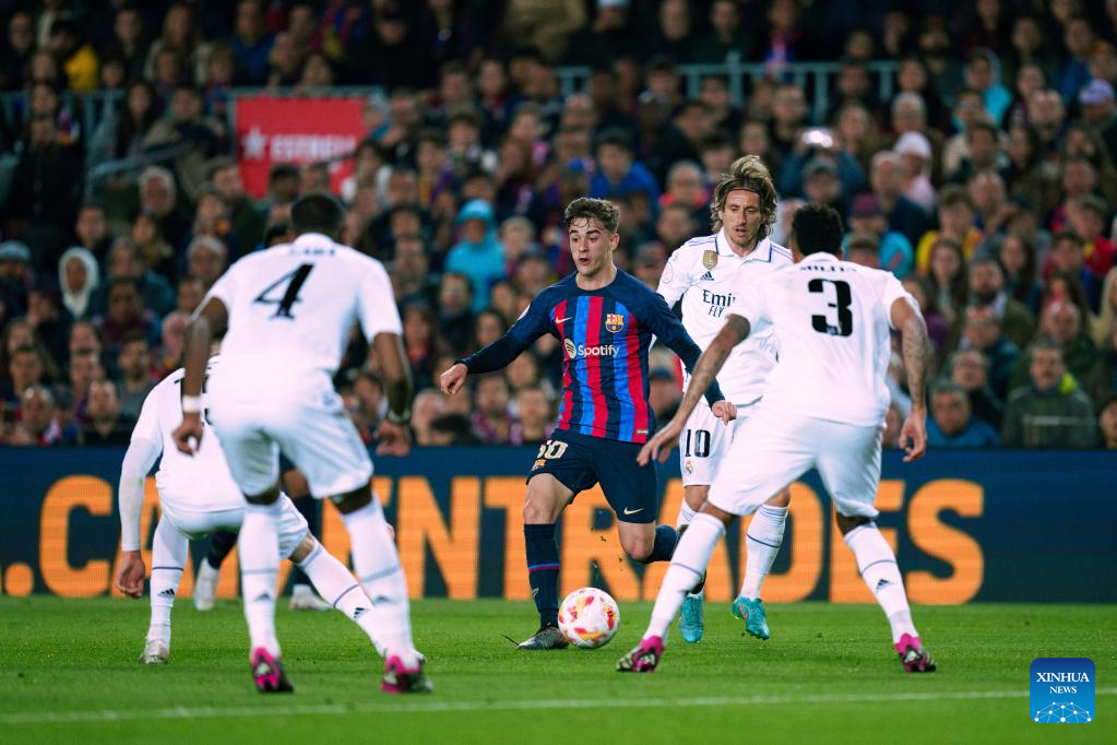Gavi (C) of Barcelona comeptes during the King's Cup semifinal second leg match between FC Barcelona and Real Madrid in Barcelona, Spain, April 5, 2023. (Photo by Joan Gosa/Xinhua)
