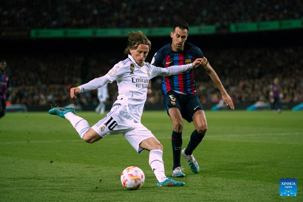 Sergio Busquets (R) of Barcelona vies with Luka Modric of Real Madrid during the King's Cup semifinal second leg match between FC Barcelona and Real Madrid in Barcelona, Spain, April 5, 2023. (Photo by Joan Gosa/Xinhua)