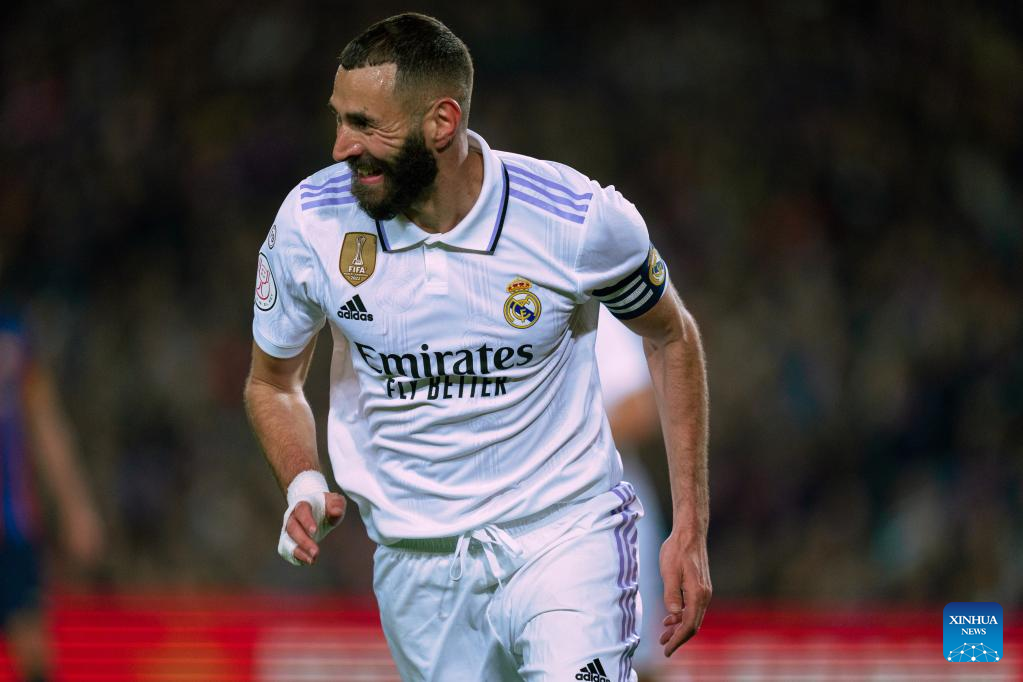 Karim Benzema of Real Madrid celebrates his goal during the King's Cup semifinal second leg match between FC Barcelona and Real Madrid in Barcelona, Spain, April 5, 2023. (Photo by Joan Gosa/Xinhua)