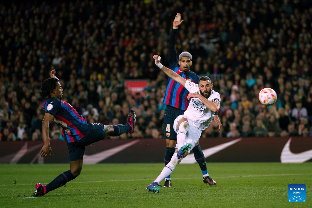 Karim Benzema (R) of Real Madrid shoots during the King's Cup semifinal second leg match between FC Barcelona and Real Madrid in Barcelona, Spain, April 5, 2023. (Photo by Joan Gosa/Xinhua)
