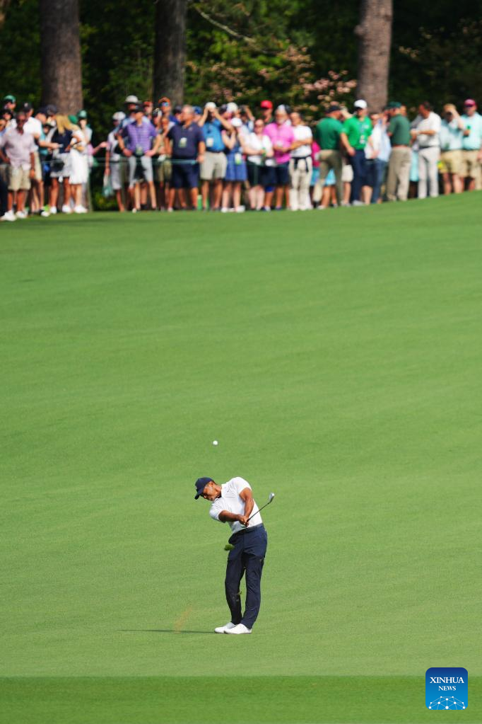 Tiger Woods of the United States hits during the first round of the 2023 Masters golf tournament at Augusta National Golf Club in Augusta, the United States, on April 6, 2023. (Xinhua/Wu Xiaoling)