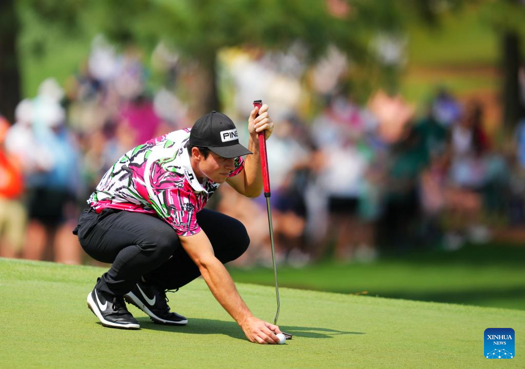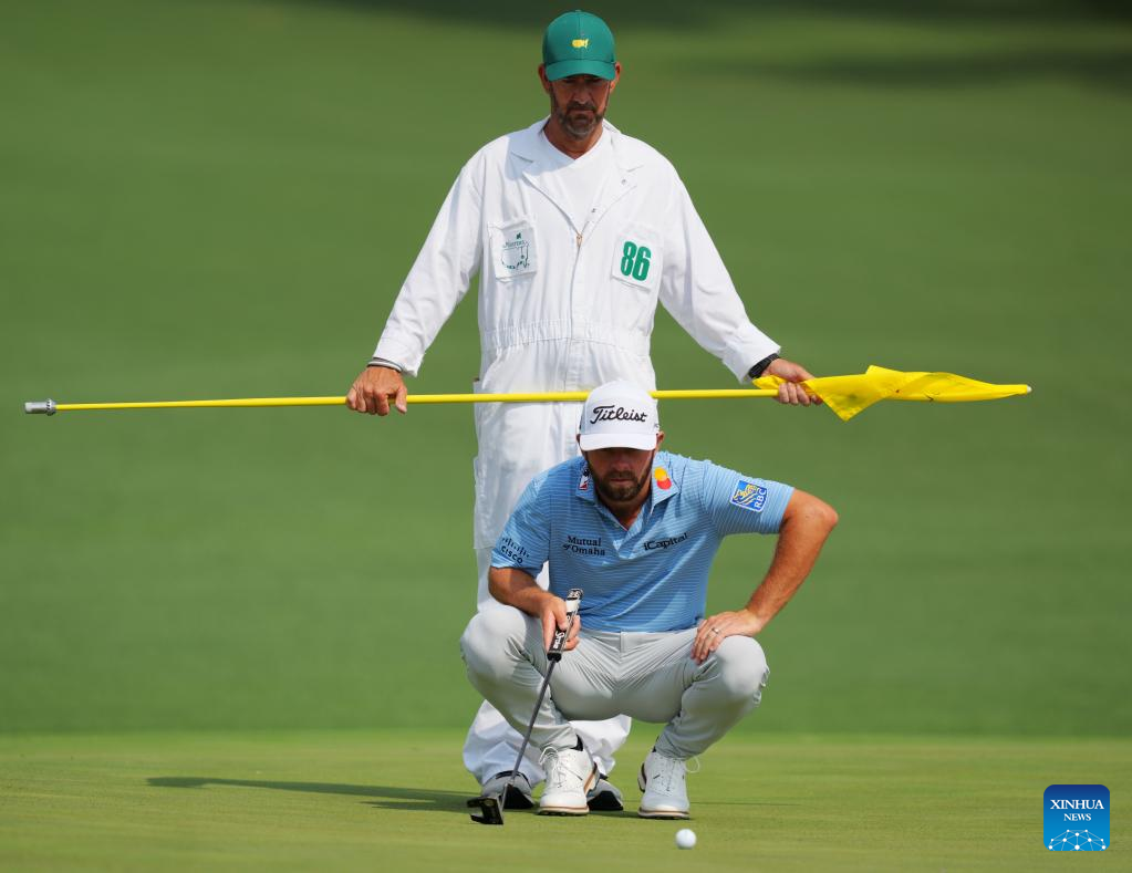 Cameron Young of the United States lines up a putt during the first round of the 2023 Masters golf tournament at Augusta National Golf Club in Augusta, the United States, on April 6, 2023. (Xinhua/Wu Xiaoling)