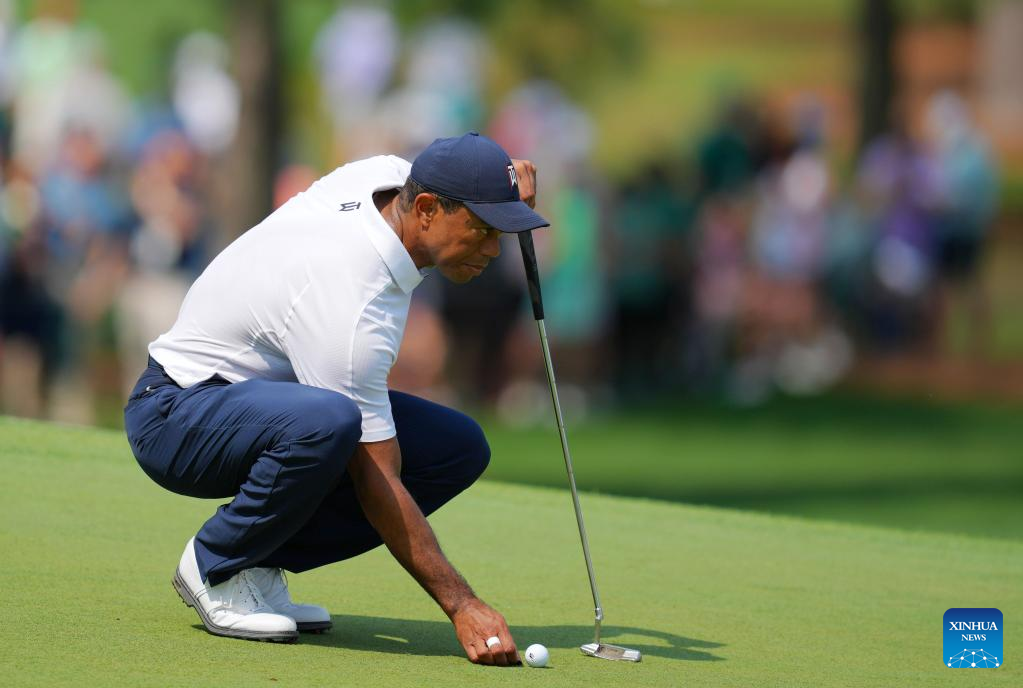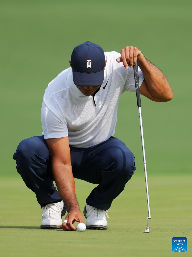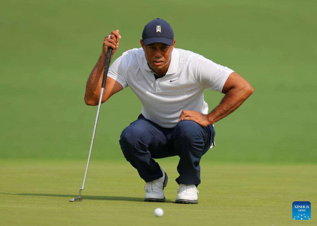 Tiger Woods of the United States lines up a putt during the first round of the 2023 Masters golf tournament at Augusta National Golf Club in Augusta, the United States, on April 6, 2023. (Xinhua/Wu Xiaoling)