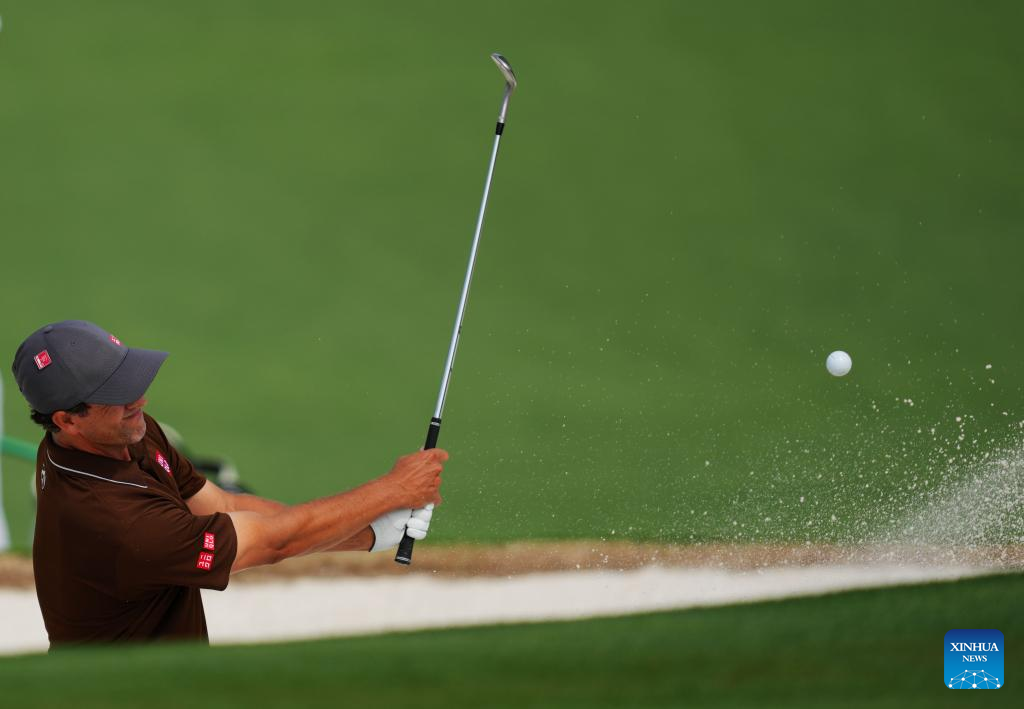 Adam Scott of Australia hits from the sand during the first round of the 2023 Masters golf tournament at Augusta National Golf Club in Augusta, the United States, on April 6, 2023. (Xinhua/Wu Xiaoling)
