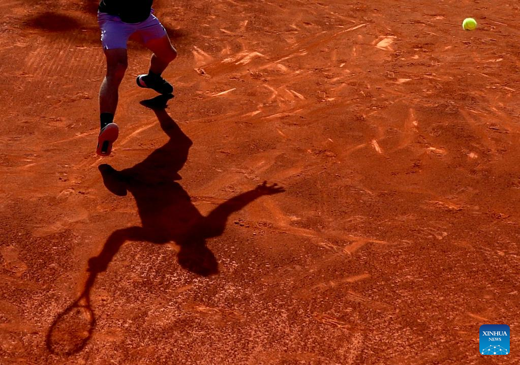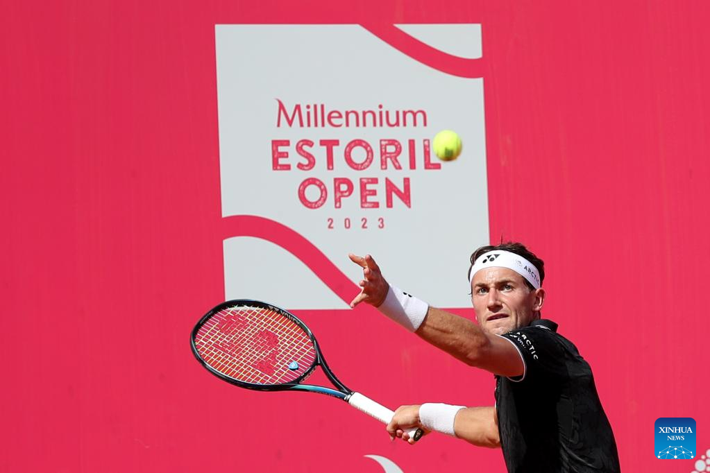Casper Ruud of Norway hits a return during the men's singles final against Miomir Kecmanovic of Serbia at the Clube de Tenis do Estoril in Cascais, Portugal, on April 9, 2023. (Photo by Pedro Fiuza/Xinhua)