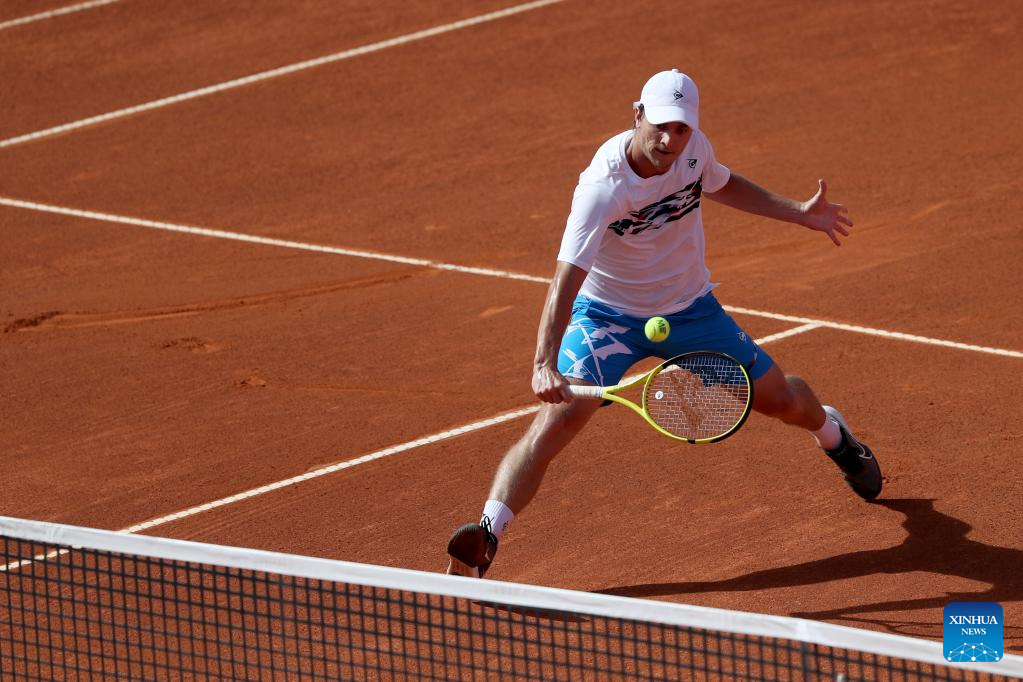 Miomir Kecmanovic of Serbia hits a return during the men's singles final against Casper Ruud of Norway at the Clube de Tenis do Estoril in Cascais, Portugal, on April 9, 2023. (Photo by Pedro Fiuza/Xinhua)