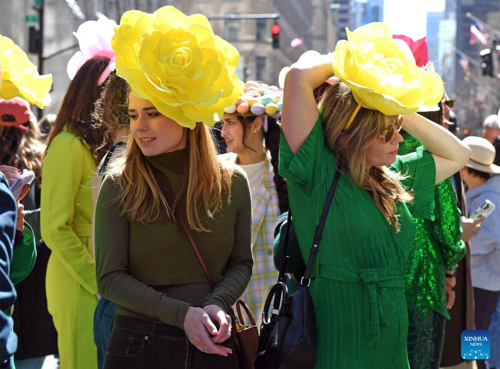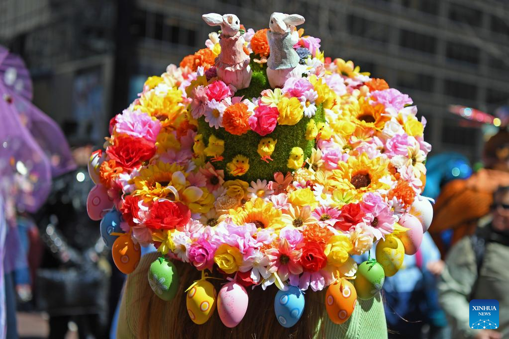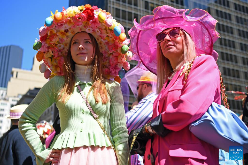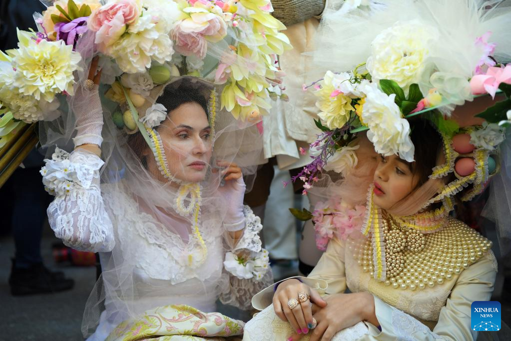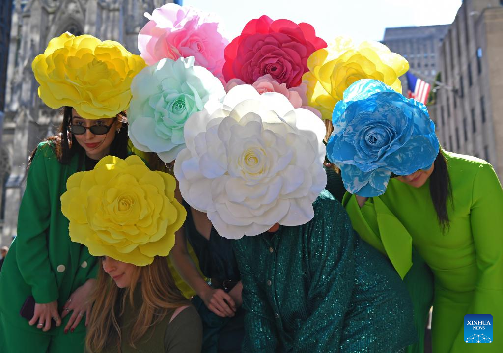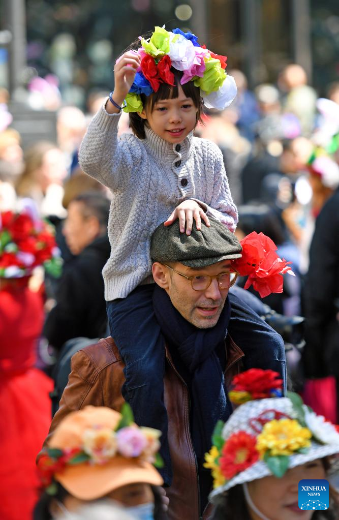 People take part in the Easter Bonnet Parade in New York, the United States, on April 9, 2023. The annual Easter Bonnet Parade took place on the Fifth Avenue of Manhattan near St. Patrick's Cathedral on Sunday. (Xinhua/Li Rui)