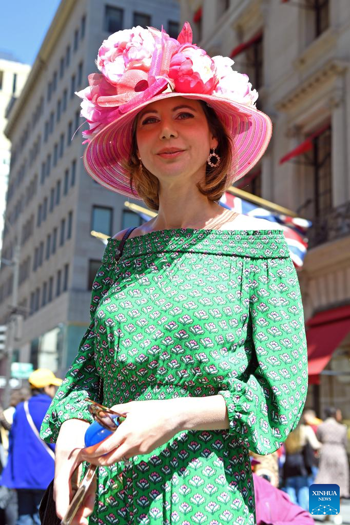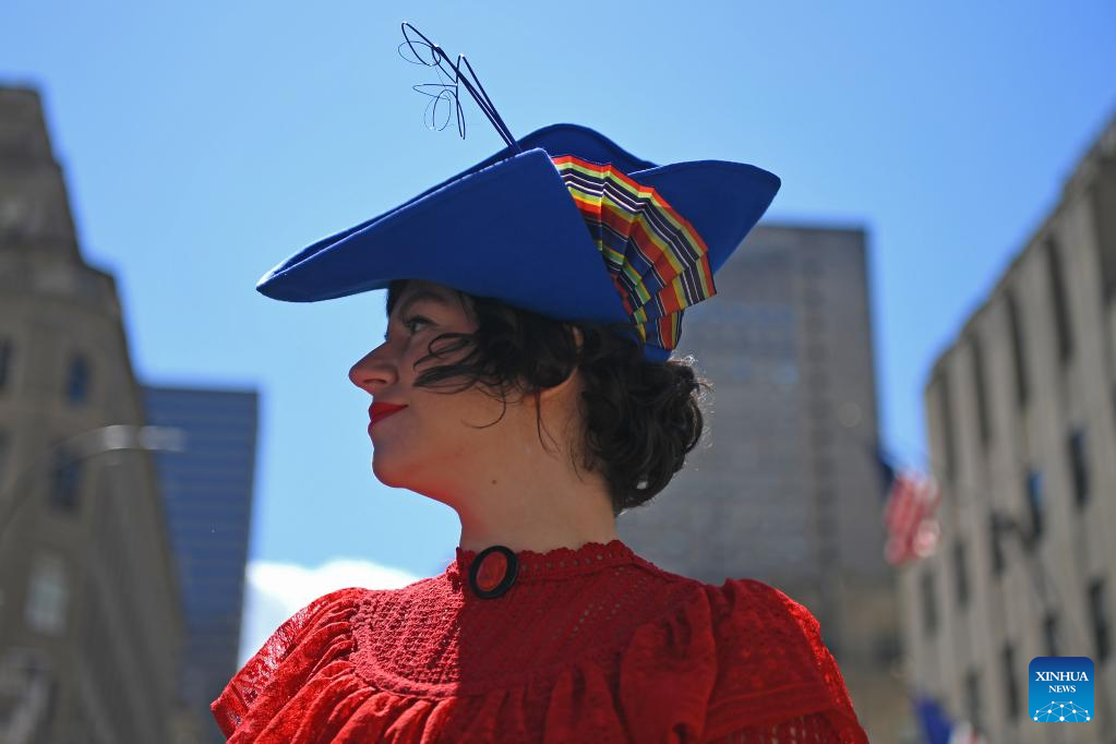 A woman takes part in the Easter Bonnet Parade in New York, the United States, on April 9, 2023. The annual Easter Bonnet Parade took place on the Fifth Avenue of Manhattan near St. Patrick's Cathedral on Sunday. (Xinhua/Li Rui)