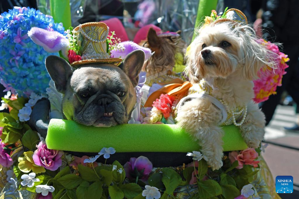 Dogs in creative outfits are pictured during the Easter Bonnet Parade in New York, the United States, on April 9, 2023. The annual Easter Bonnet Parade took place on the Fifth Avenue of Manhattan near St. Patrick's Cathedral on Sunday. (Xinhua/Li Rui)