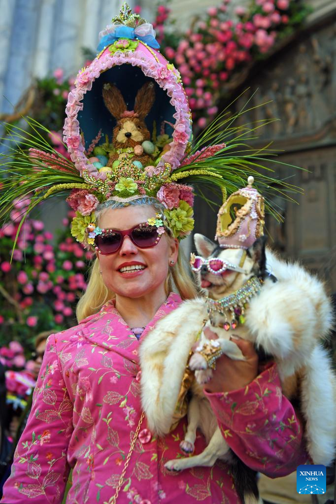 A woman holding a dog takes part in the Easter Bonnet Parade in New York, the United States, on April 9, 2023. The annual Easter Bonnet Parade took place on the Fifth Avenue of Manhattan near St. Patrick's Cathedral on Sunday. (Xinhua/Li Rui)