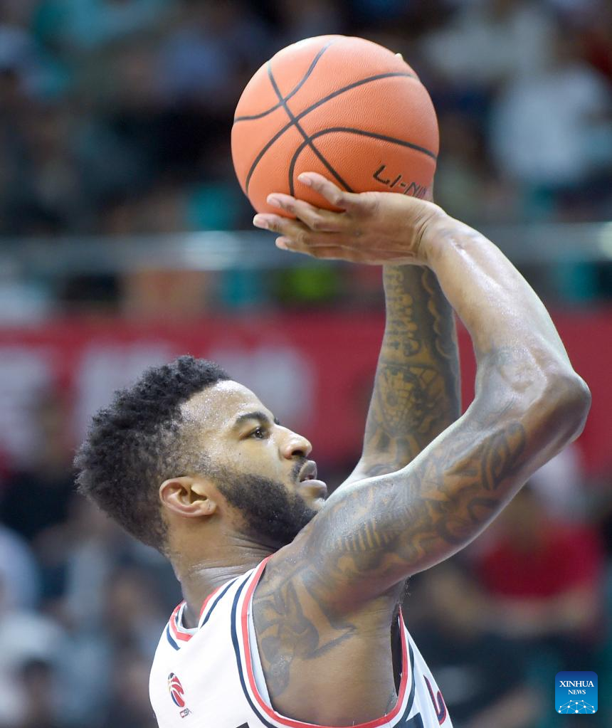 Jordan Bell of Guangzhou Loong Lions shoots the ball during the play off match between Shandong Heroes and Guangzhou Loong Lions at 2022-2023 season of the Chinese Basketball Association (CBA) league in Guangzhou, south China's Guangdong Province, April 11, 2023. (Xinhua/Lu Hanxin)