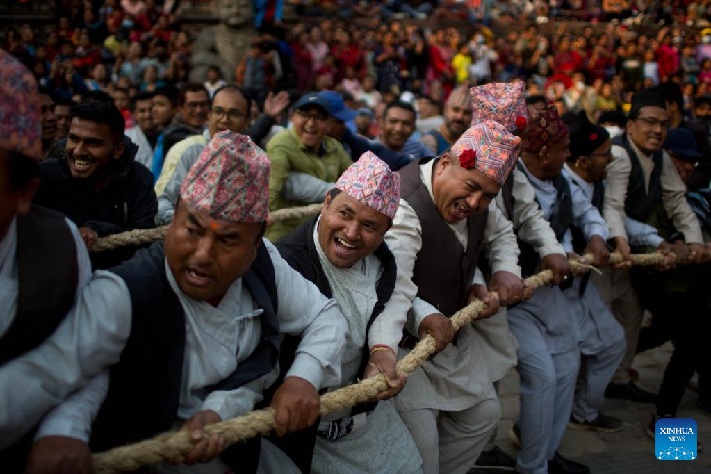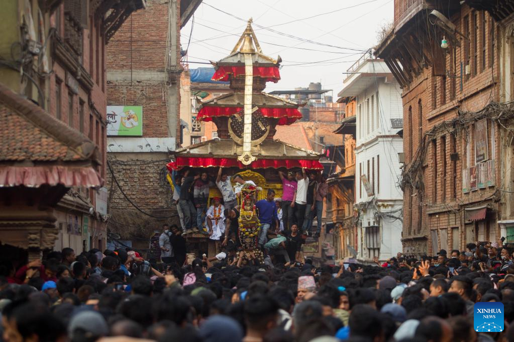 People pull the chariot of Lord Bhairav during the first day of the Bisket Jatra Festival at Bhaktapur Durbar Square in Bhaktapur, Nepal, April 10, 2023. The festival is celebrated annually to welcome the arrival of spring and the start of Nepali New Year. (Photo by Sulav Shrestha/Xinhua)