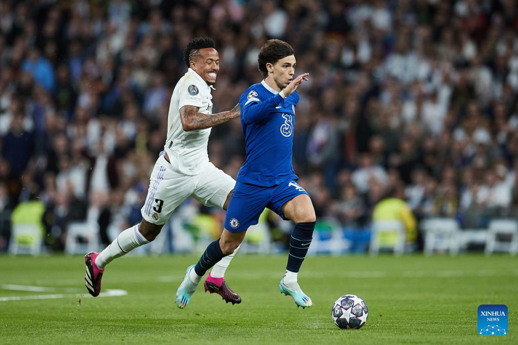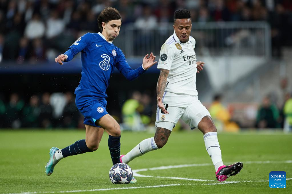 Real Madrid's Eder Militao (L) vies with Chelsea's Joao Felix during the UEFA Champions League quarterfinal first Leg match between Real Madrid and Chelsea FC in Madrid, Spain, on April 12, 2023. (Xinhua/Meng Dingbo)