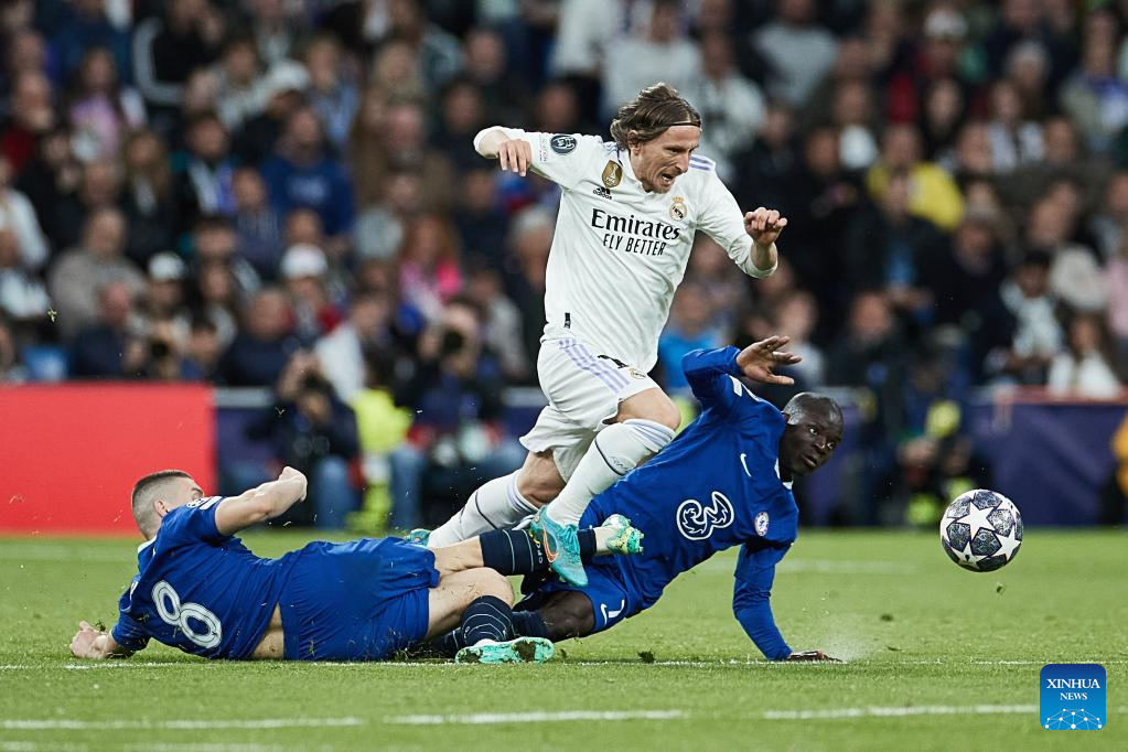 Real Madrid's Luka Modric (top) vies with Chelsea's N'Golo Kante and Mateo Kovacic during the UEFA Champions League quarterfinal first Leg match between Real Madrid and Chelsea FC in Madrid, Spain, on April 12, 2023. (Xinhua/Meng Dingbo)