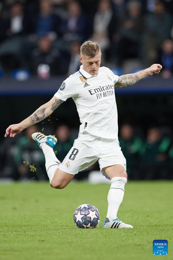 Real Madrid's Toni Kroos shoots the ball during the UEFA Champions League quarterfinal first Leg match between Real Madrid and Chelsea FC in Madrid, Spain, on April 12, 2023. (Xinhua/Meng Dingbo)