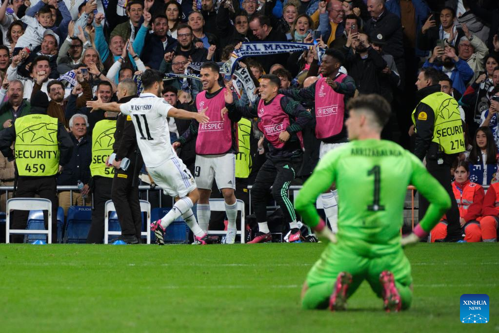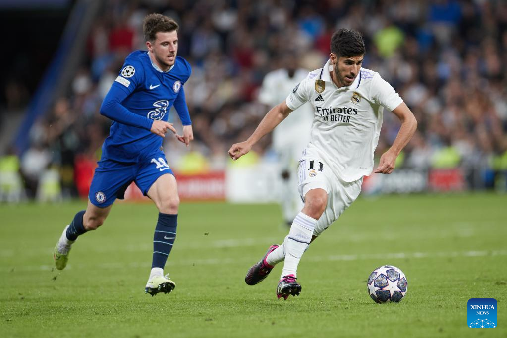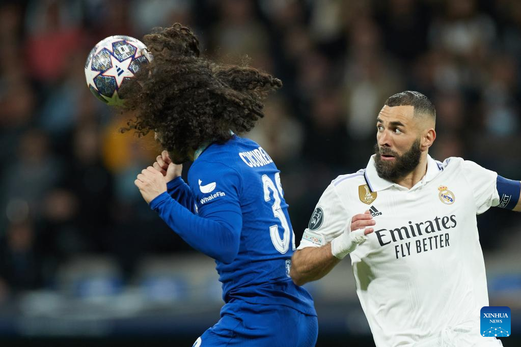 MADRID, April 12 (Xinhua) -- Goals from Karim Benzema and Marco Asensio gave Real Madrid a 2-0 first-leg lead in their Champions League quarterfinal against Chelsea on Wednesday.