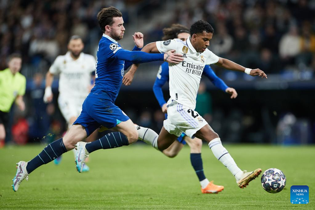 Real Madrid's Rodrygo (L) vies with Chelsea's Marc Cucurella during the UEFA Champions League quarterfinal first Leg match between Real Madrid and Chelsea FC in Madrid, Spain, on April 12, 2023. (Xinhua/Meng Dingbo)