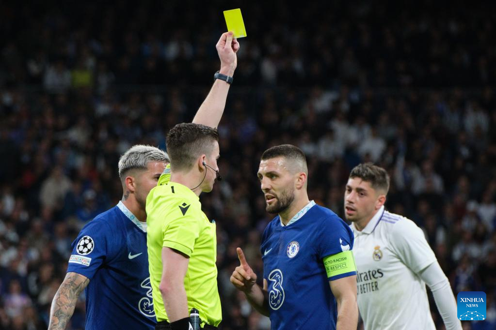 Chelsea's Mateo Kovacic receives a yellow card during the UEFA Champions League quarterfinal first Leg match between Real Madrid and Chelsea FC in Madrid, Spain, on April 12, 2023. (Xinhua/Meng Dingbo)