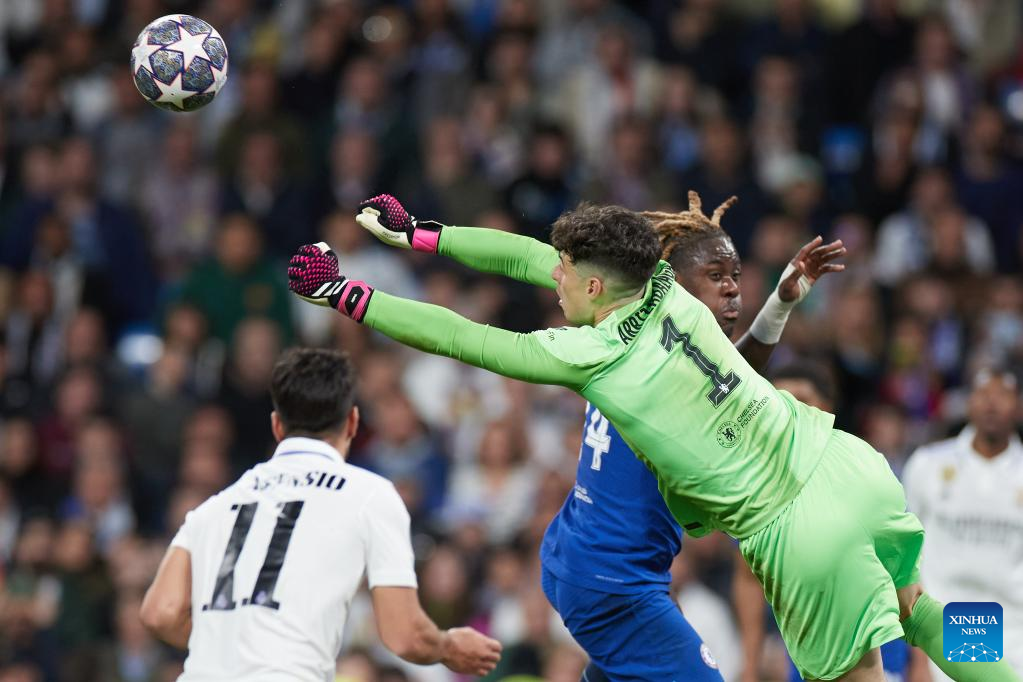 Chelsea's Kepa Arrizabalaga (L, front) saves the goal during the UEFA Champions League quarterfinal first Leg match between Real Madrid and Chelsea FC in Madrid, Spain, on April 12, 2023. (Xinhua/Meng Dingbo)