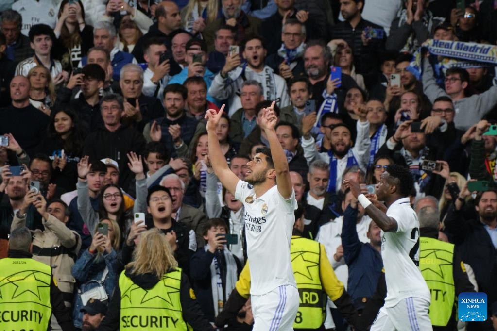 Real Madrid's Marco Asensio (front, L) celebrates his goal during the UEFA Champions League quarterfinal first Leg match between Real Madrid and Chelsea FC in Madrid, Spain, on April 12, 2023. (Xinhua/Meng Dingbo)