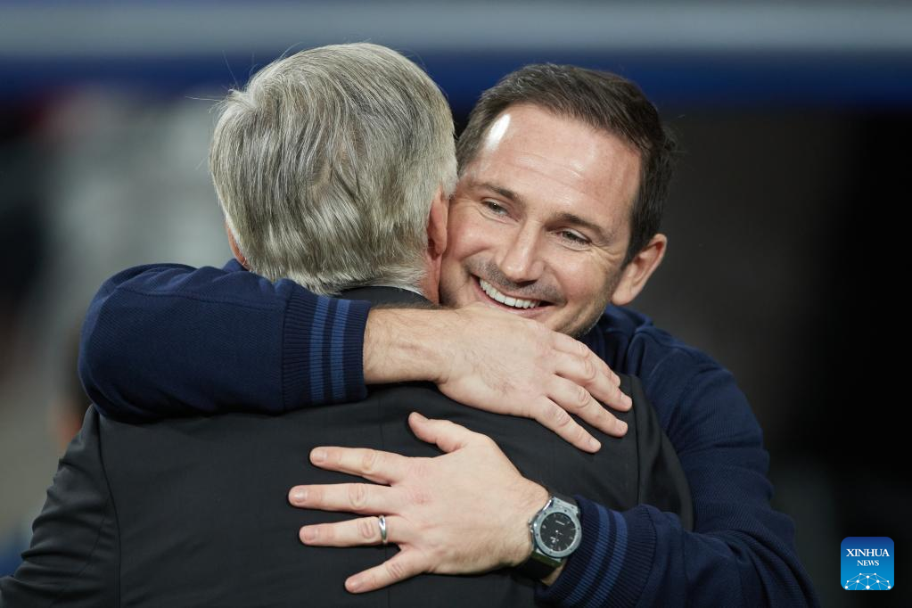 Chelsea's Frank Lampard (R) hugs Real Madrid's Carlo Ancelotti before the UEFA Champions League quarterfinal first Leg match between Real Madrid and Chelsea FC in Madrid, Spain, on April 12, 2023. (Xinhua/Meng Dingbo)
