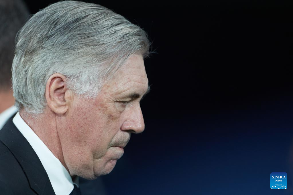 Real Madrid's Carlo Ancelotti reacts before the UEFA Champions League quarterfinal first Leg match between Real Madrid and Chelsea FC in Madrid, Spain, on April 12, 2023. (Xinhua/Meng Dingbo)