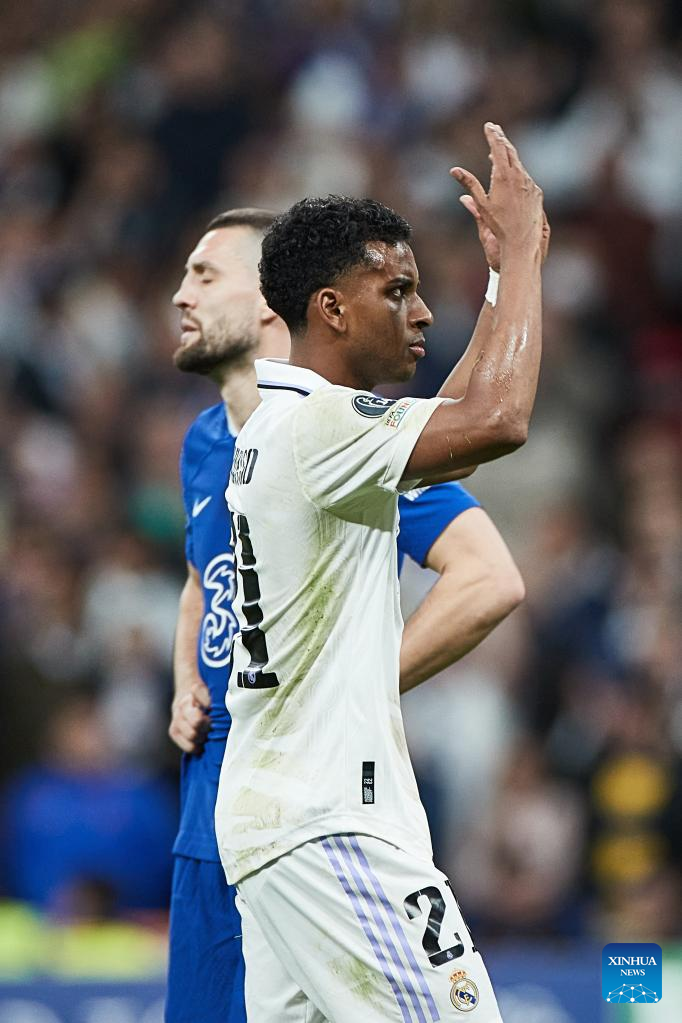 Real Madrid's Rodrygo competes during the UEFA Champions League quarterfinal first Leg match between Real Madrid and Chelsea FC in Madrid, Spain, on April 12, 2023. (Xinhua/Meng Dingbo)