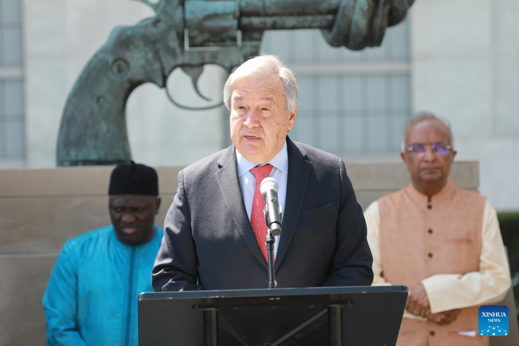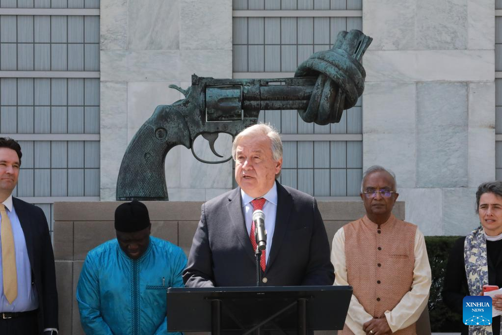 UN Secretary-General Antonio Guterres (Front) speaks at an interfaith moment of prayer for peace at a special time on the spiritual calendar at the UN headquarters in New York, on April 14, 2023. The world body on Friday held the interfaith moment of prayer for peace at a special time on the spiritual calendar, when Christians are celebrating Easter, Jews are marking Passover, Muslims are observing the holy month of Ramadan, and Sikhs are celebrating Vaisakhi. (Xinhua/Xie E)