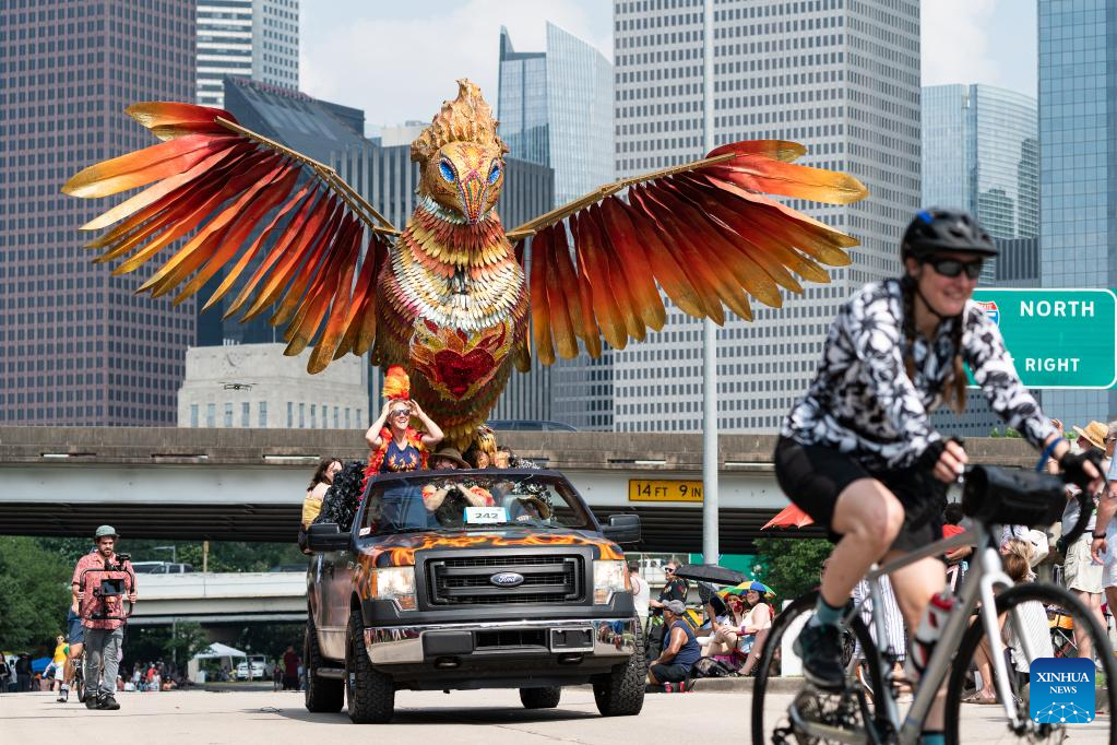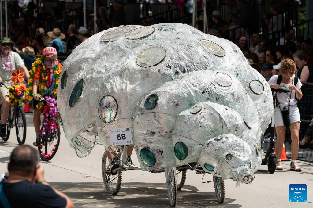 An art bike participates in the 36th Houston Art Car Parade in Houston, Texas, the United States, April 15, 2023. The yearly event gathered over 250 art cars and other exhibits, drawing in more than 250,000 spectators.