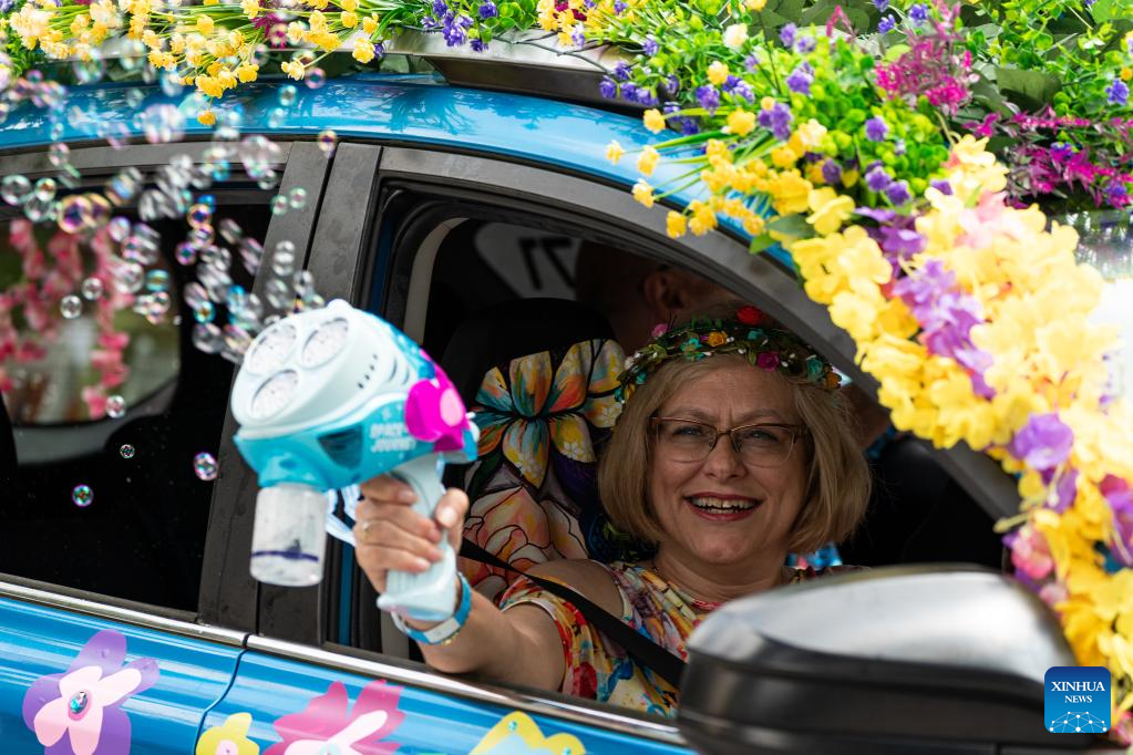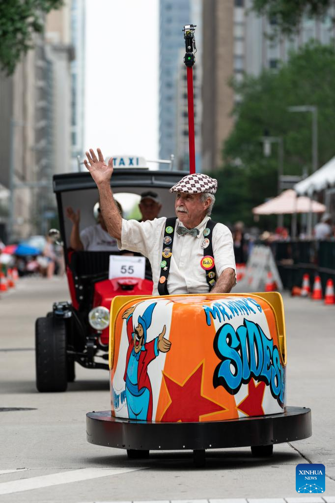 The parade showcased a diverse range of wheeled vehicles, including bicycles, unicycles, lawnmowers, cars, and go-karts. (Photo by Chen Chen/Xinhua)