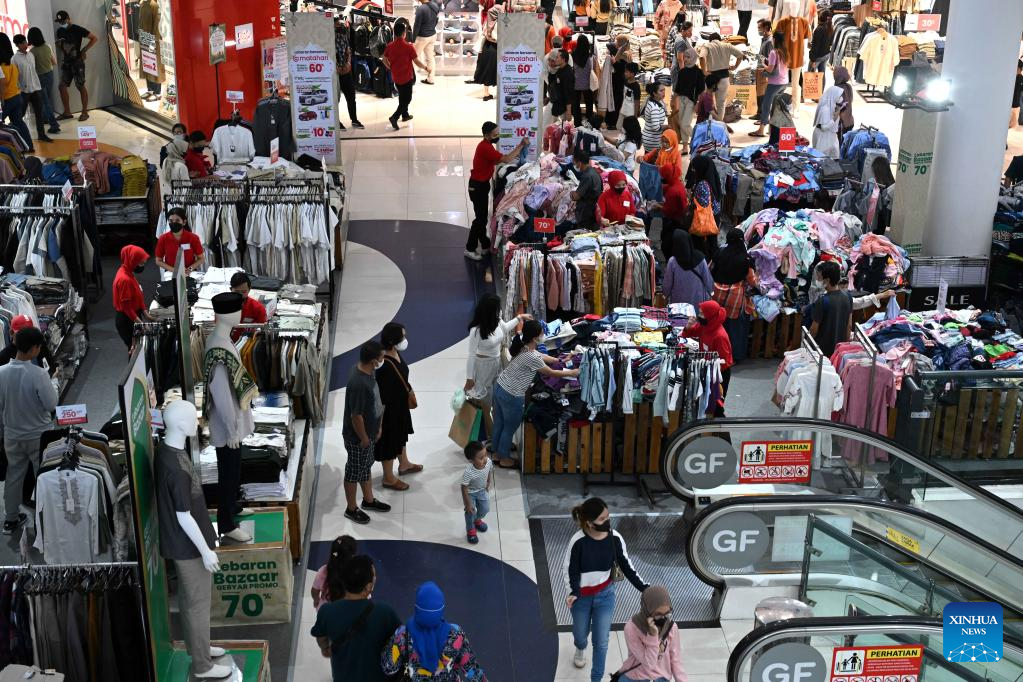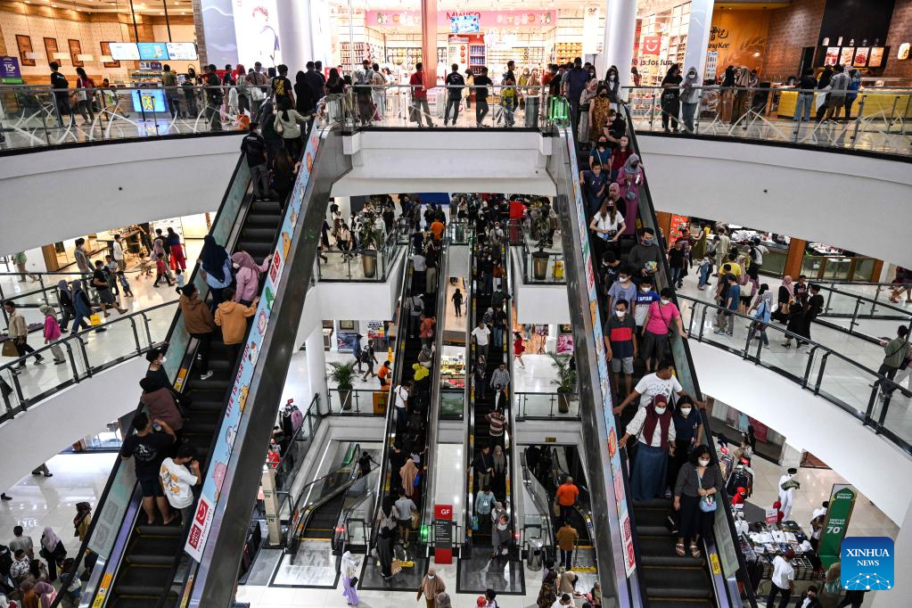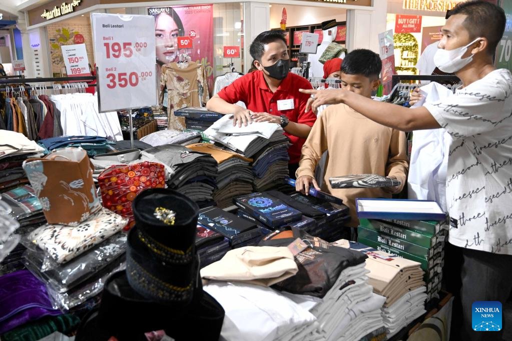 People shop during the midnight sale ahead of Eid al-Fitr in Tangerang, Banten Province, Indonesia, April 15, 2023. Midnight sales are popular in Indonesia, offering discounts ahead of holidays. (Xinhua/Agung Kuncahya B.)